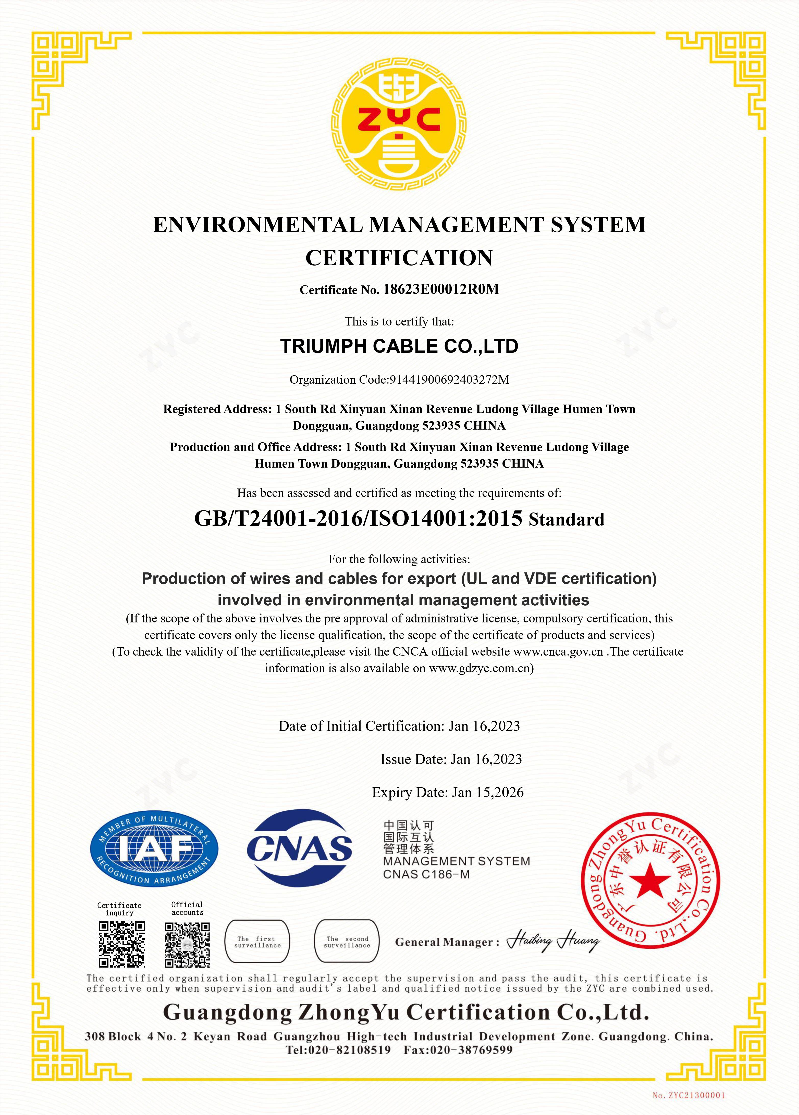 Triumph Cable-ENVIRONMENTAL MANAGEMENT SYSTEM CERTIFICATION